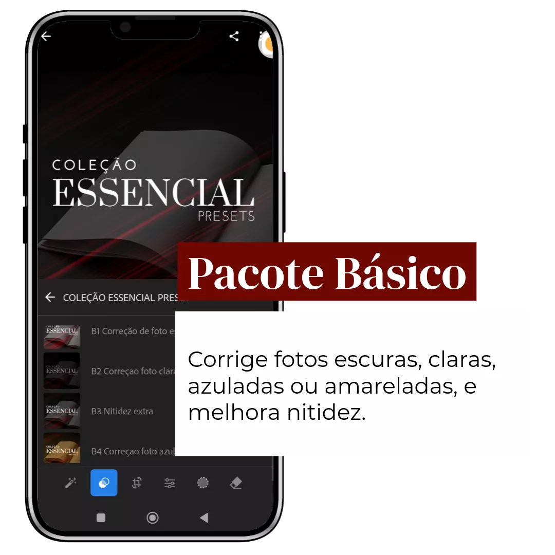 Corrija cores, ilumine e destaque detalhes com pacotes prontos para qualquer produto — aplicáveis direto no celular (Android e iOS), sem precisar saber de edição.