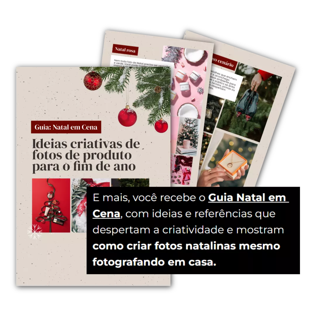 E mais, você recebe o Guia Natal em Cena, com ideias e referências que despertam a criatividade e mostram como criar fotos natalinas mesmo fotografando em casa.